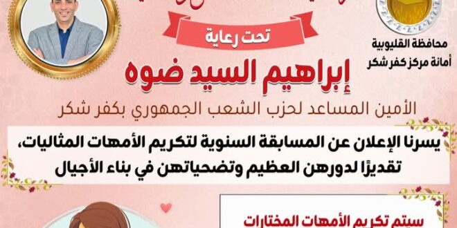 تطلق أمانة حزب الشعب الجمهوري بكفر شكر مسابقتها السنوية لتكريم الأمهات المثاليات،