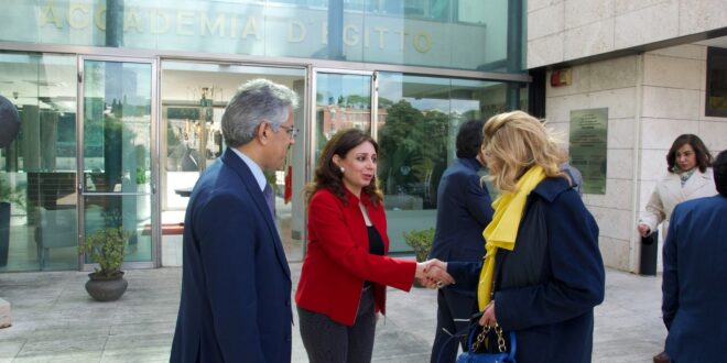 من جانبها رحبت مديرة الأكاديمية الأستاذة الدكتورة رانيا يحيى بسيادة السفير المصري وجميع السادة السفراء وتوجهت لهم بالشكر وعبرت عن فكرة المبادرة التي أطلقتتها للتركيز على الحضارة العربية وتعزيز هويتها عن طريق تقديم الثقافة والفن المتميز لكل دولة عربية من خلال هذا المنبر الثقافي المتفرد في قلب أوروبا وضرورة ما تمثله تلك المبادرة لتسليط الضوء على التنوع الثقافي الثري في دولنا العربية واستغلال إمكانات الأكاديمية لعرض ما تكتنزه الدول العربية من ثراء وغزارة فى الهوية الثقافية وعرضها للجمهور الإيطالي والأوروبي.