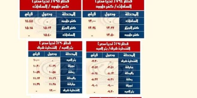 تشغيل قطار 792 السادات / كفر داوود حيث يقوم من محطة السادات 09:00 يصل محطة كفر داوود الساعة 09:50 بتركيب ( 5 عربات تحيا مصر ) كالجدول المرفق.