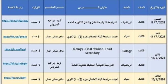 صرح محمد رمضان غريب وكيل وزارة التربية والتعليم بدمياط ان مديرية التربية والتعليم بدمياط تعلن عن جدول المراجعات النهائية المجانية لمواد “الرياضيات والاحياء وBiology” لطلاب الثانوية العامة