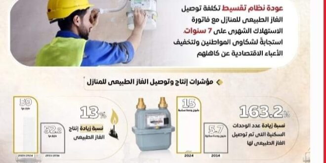 وأشار التقرير إلى عودة نظام تقسيط تكلفة توصيل الغاز الطبيعي للمنازل مع فاتورة الاستهلاك الشهري على 7 سنوات، وذلك استجابة لشكاوى المواطنين ولتخفيف الأعباء الاقتصادية عن كاهلهم.