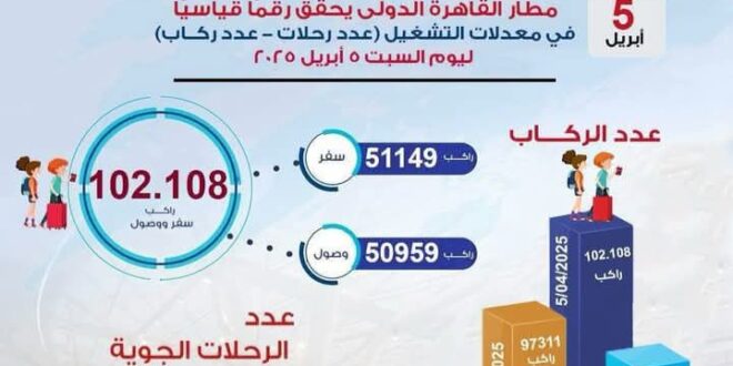لمواكبة التقدم المستمر فى مجال صناعة النقل الجوي،، حقق مطار القاهرة الدولي رقماً قياسياً جديداً وغير مسبوق بتسجيله لأعلى نسبة تشغيل بلغت 102.108 ألف راكب في يوم واحد وهي تعد المرة الأولى منذ افتتاحه في 18 مايو 1963 ..كما بلغ إجمالي عدد الرحلات الجوية(682) رحلة، منها (343) رحلة في السفر و(339) رحلة في الوصول، مما يؤكد قدرة المطار على تلبية الطلب المتزايد لحركة السفر، ويشير إلى الكفاءة العالية التي يحظى بها مطار القاهرة الدولي و مدى جاهزيته لاستيعاب أكبر عدد من السياح والمسافرين كونه بوابة مصر الأولى ومركز رئيسي للنقل الجوي في المنطقة.