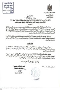 وأشار الوزير إلى أن وزارة العمل أصدرت اليوم الكتاب الدوري رقم (20) لسنة 2025 إلى كافة مديريات العمل بالمحافظات، بشأن منح العاملين الخاضعين لأحكام قانون العمل إجازة رسمية مدفوعة الأجر بهذه المناسبة، في إطار حرص الوزارة على توحيد مواعيد الإجازات الرسمية لجميع قطاعات الدولة، تحقيقًا للغاية الاجتماعية والقومية منها.