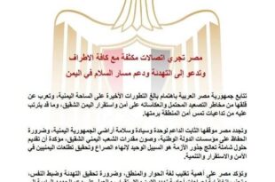 كتبت مرفت عبد القادر تتابع جمهورية مصر العربية باهتمام بالغ التطورات الأخيرة على الساحة اليمنية، وتعرب عن قلقها من مخاطر التصعيد المحتمل وانعكاساته على أمن واستقرار اليمن الشقيق، وما قد يترتب عليه من تداعيات تمس أمن المنطقة برمتها. وتجدد مصر موقفها الثابت الداعم لوحدة وسيادة وسلامة أراضي الجمهورية اليمنية، وضرورة الحفاظ على مؤسسات الدولة الوطنية، وصون مقدرات …